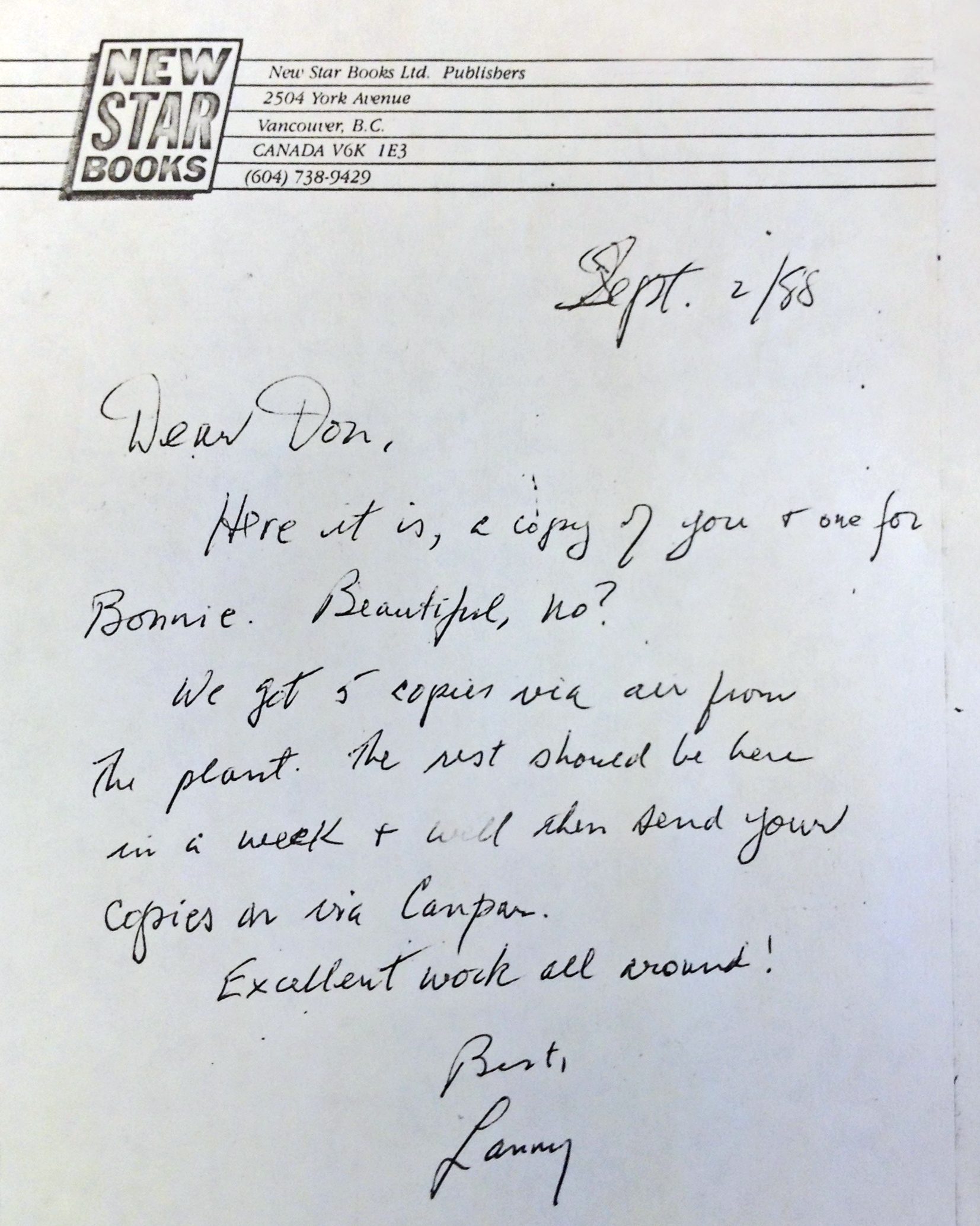 Lanny sent the first copies of Shrink Resistant to Don and Bonnie on September 2, 1988 in a now-battered brown envelope. The jaunty note which he tucked in with the new books conveying pride in a job well done.