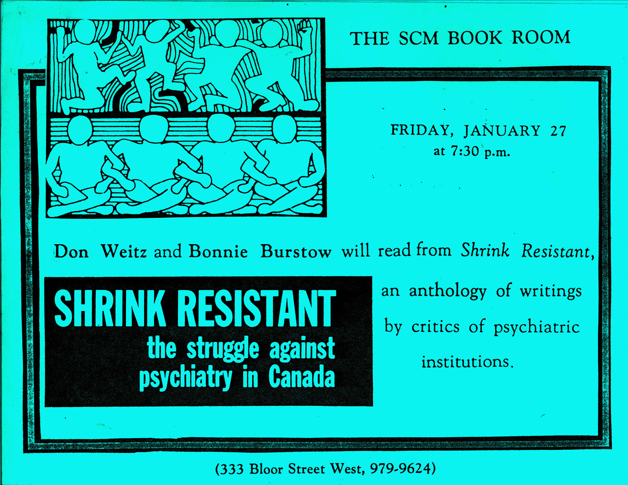 Blue poster "Alternatives to Psychiatry: An evening of entertainment including readings from Shrink Resistant and Video "Psychiatry's Gonna Die," July 1989, 252 Bloor St W