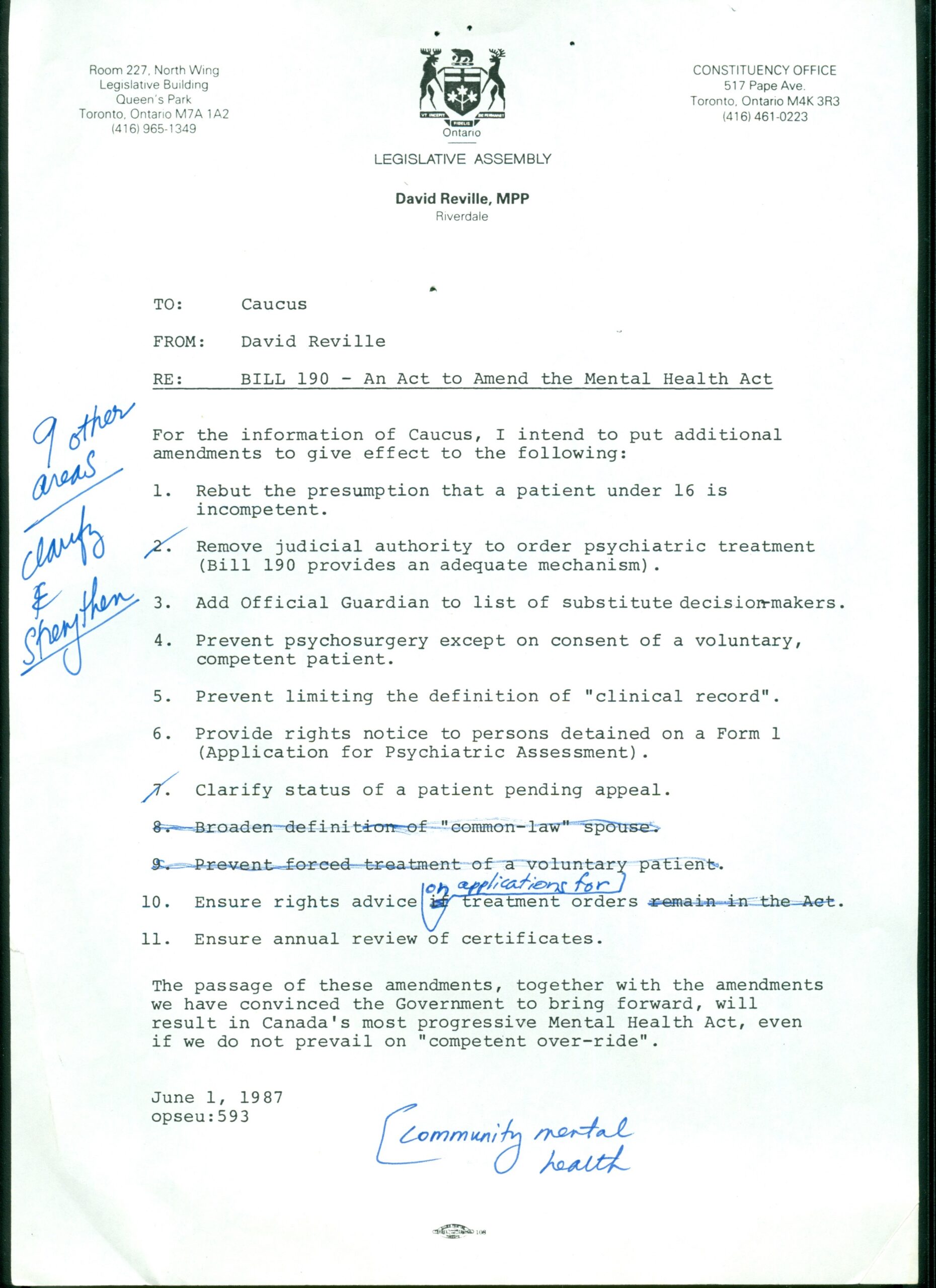Amendments to Bill 190: David’s report to caucus regarding additional amendments to Bill 190: An Act to Amend the Mental Health Act. Dated 1987.