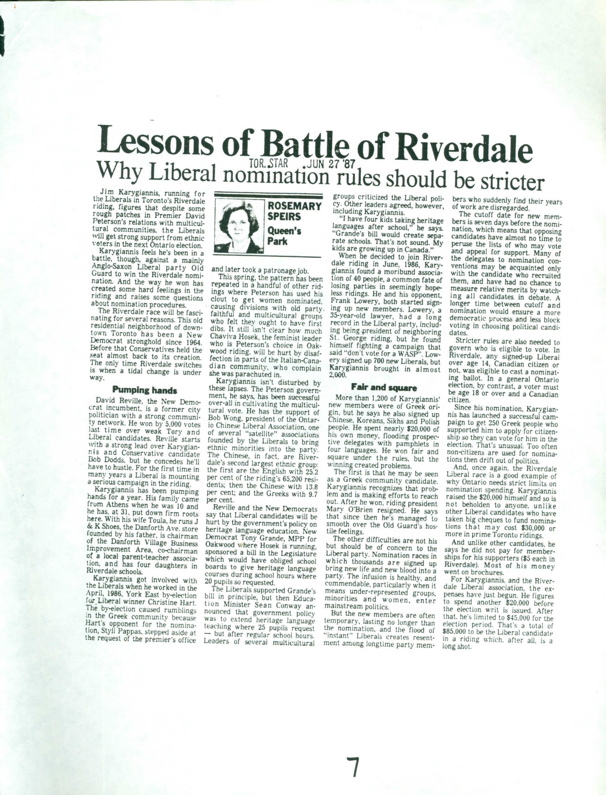 1987 Election Analysis: article from the Toronto Star titled “Lessons of Battle of Riverdale.” It discusses the unlikelihood of Liberal Jim Karygiannis defeating NDP incumbent, David Reville, in Toronto’s Riverdale riding. Dated June 27th, 1987.