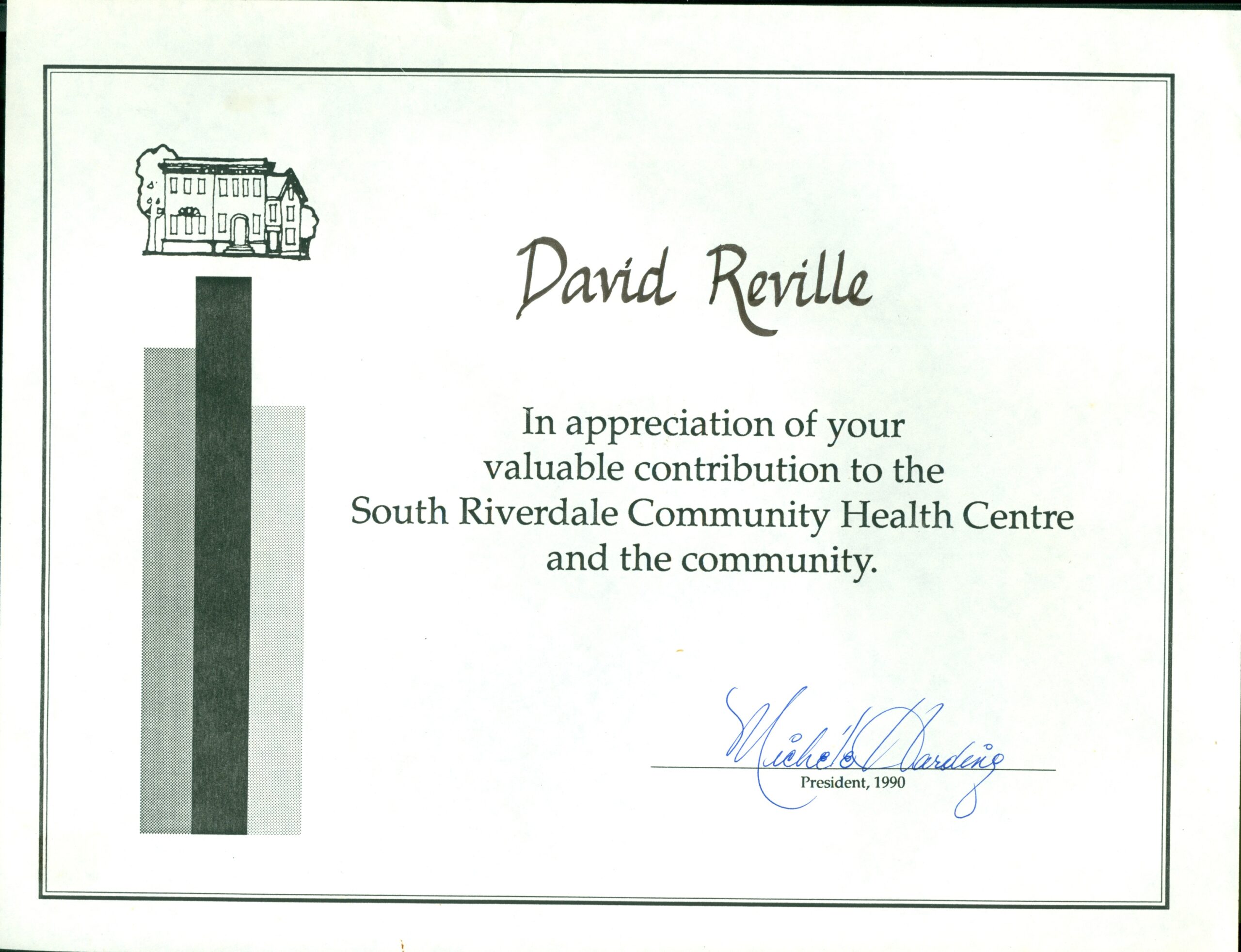 Certificate of Appreciation: document recognizing David’s contribution to the South Riverdale Community Health Centre. Dated 1990.