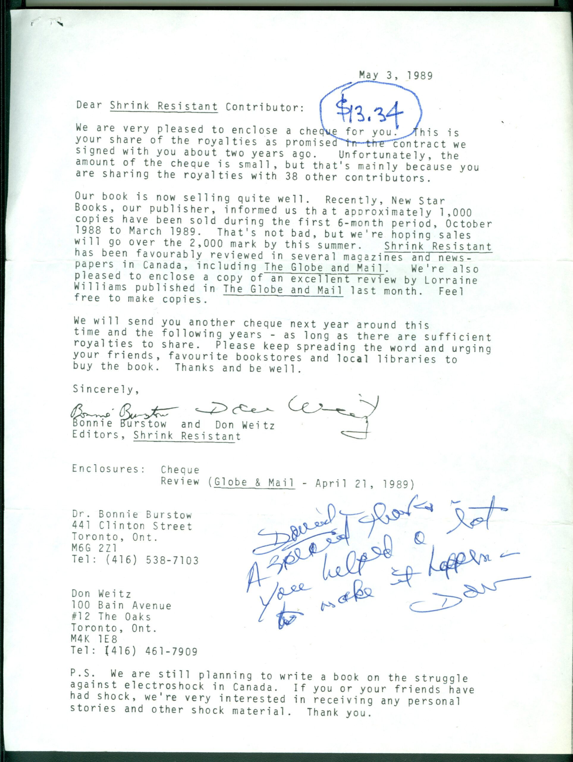Notice of cheque from Bonnie Burstow and Don Weitz for $13.34 (total amount of royalties) being paid to David. Dated May 3rd, 1989.