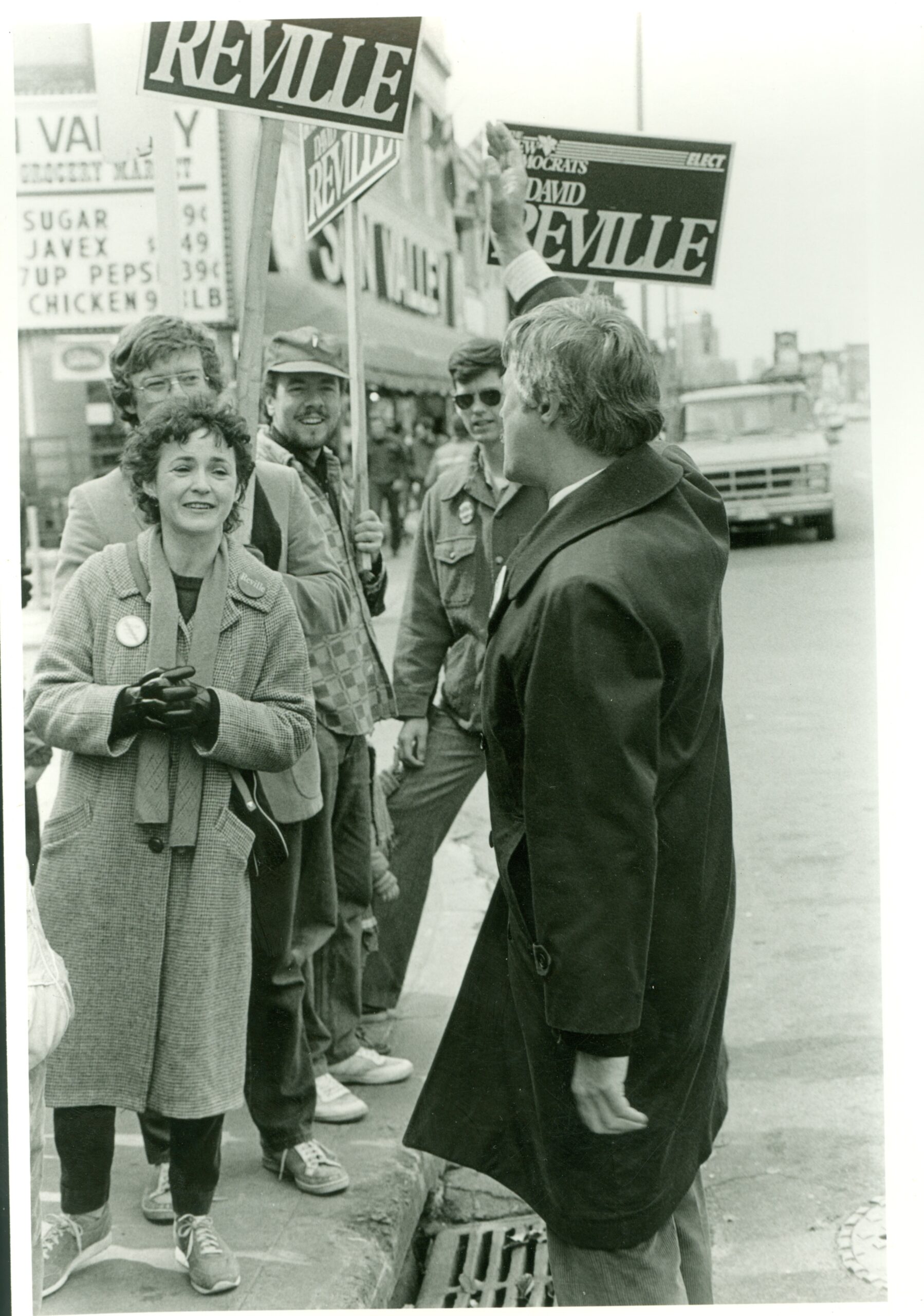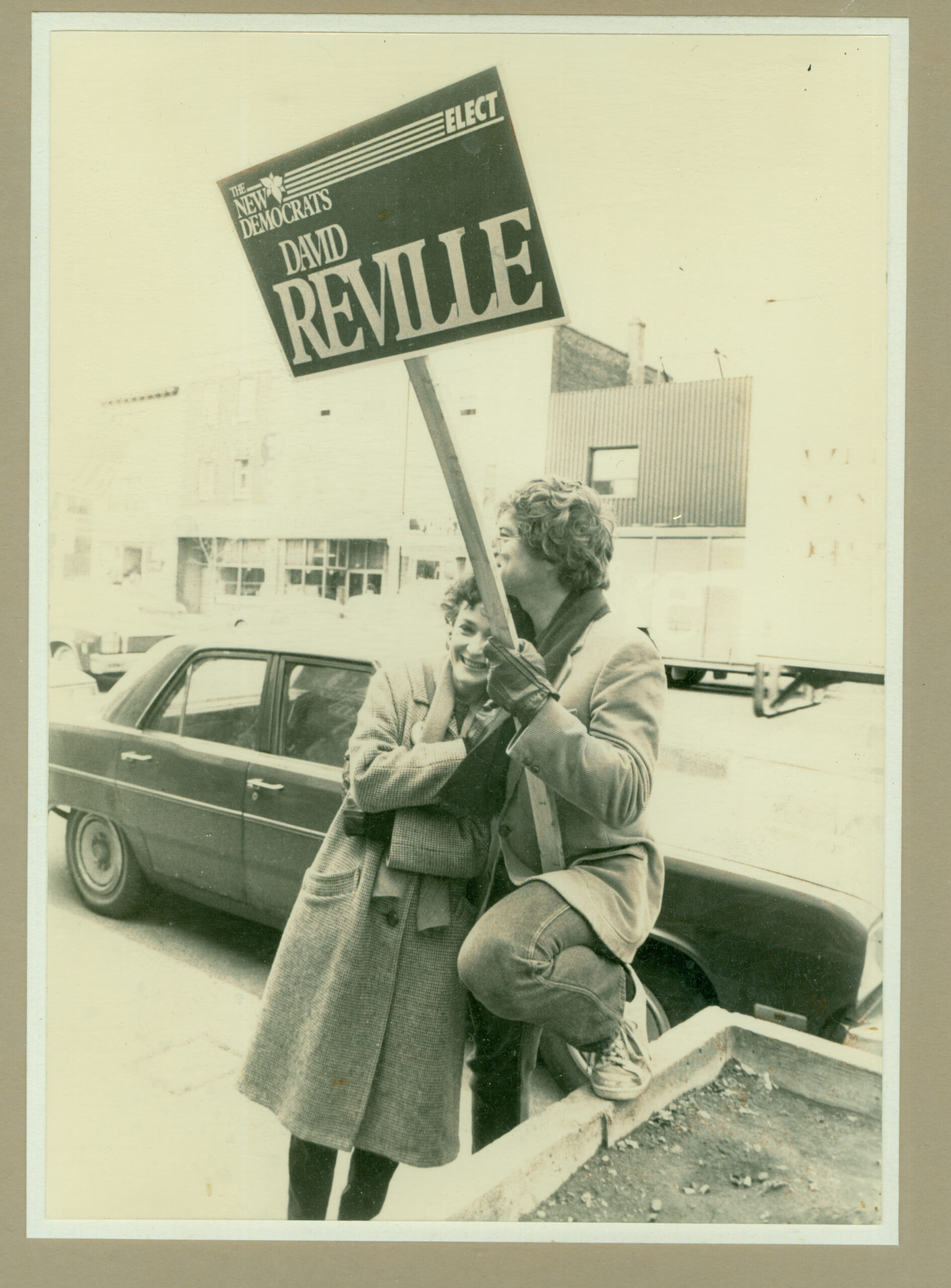 Election Campaign: photo of two of David’s supporters holding a sign reading “Elect David Reville” during one of his electoral campaigns. Dated 1985.
