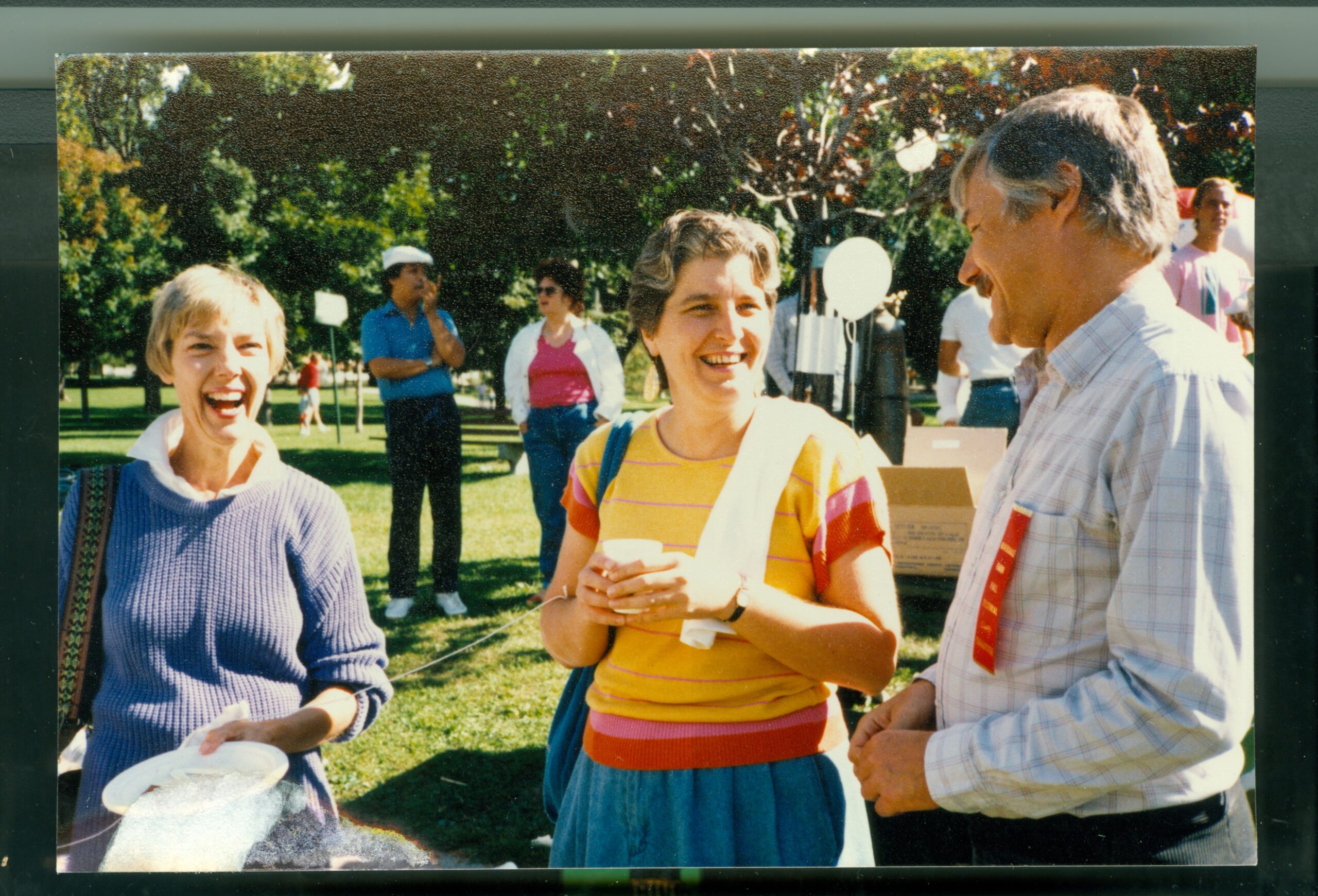 David Speaking to Barbara Hall: photograph of David speaking to B. Hall at a fall festival in Cabbagetown. Circa 1987.