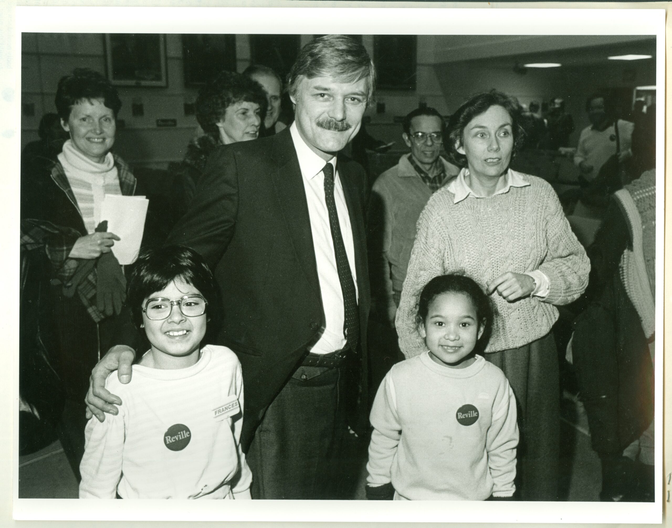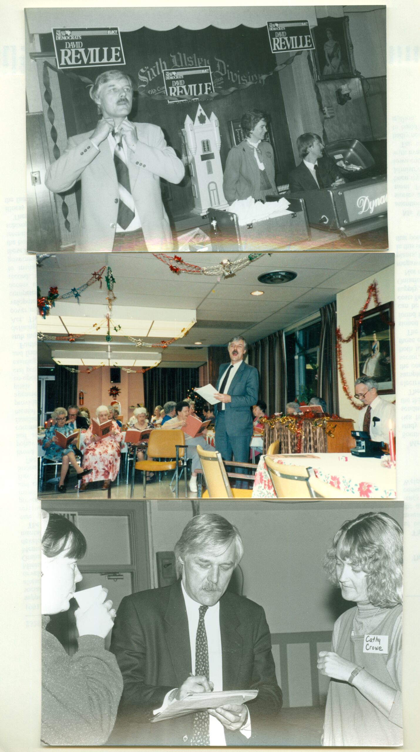 David at Work: three photographs of David; the top image is of David’s election victory party in 1985, the middle photo was captured during a singsong event at McLeary Towers (a senior’s home) 1986 the bottom one is of David speaking to renowned street nurse, Cathy Crowe, 1987.