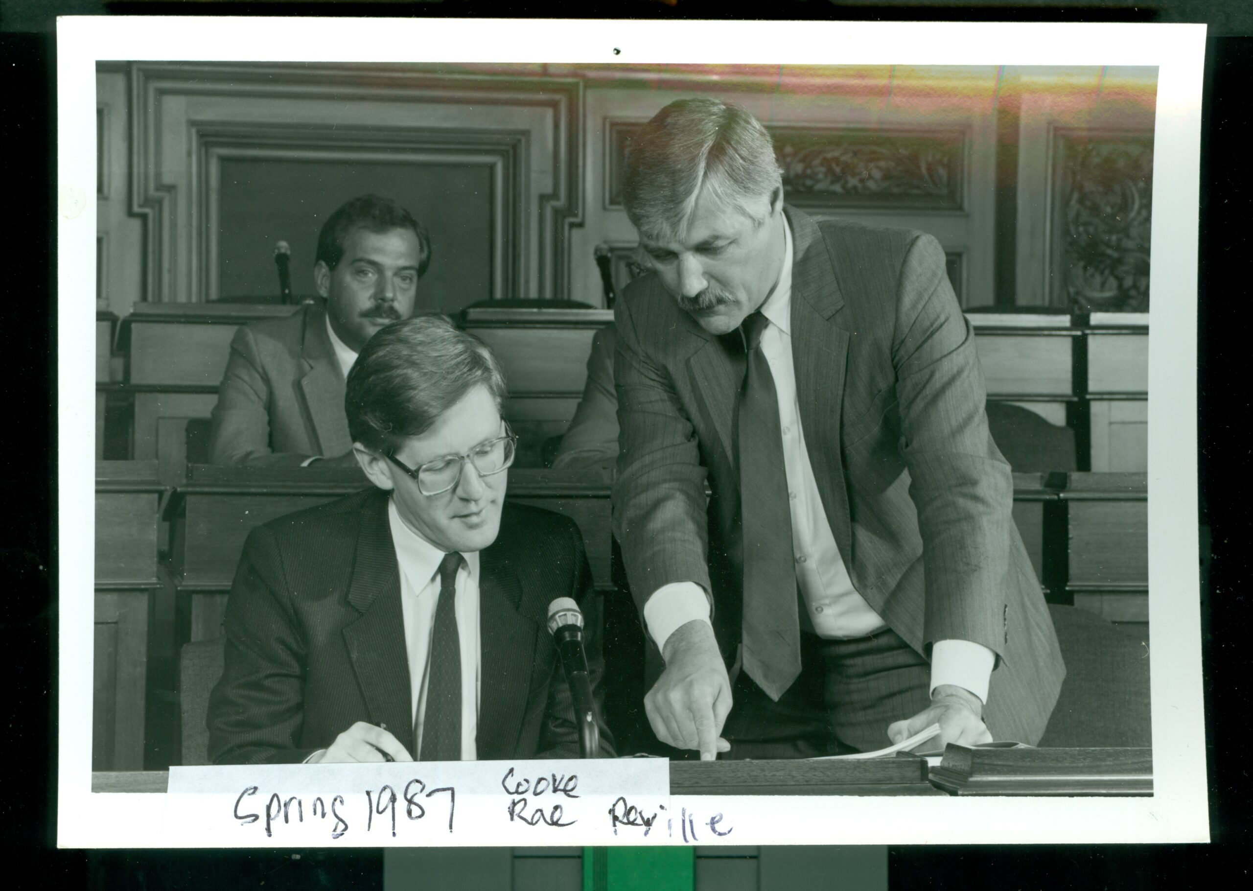 David and Bob Rae: photograph of David and former Premier of Ontario, B. Rae, with Dave Cooke in the background. Dated 1987.