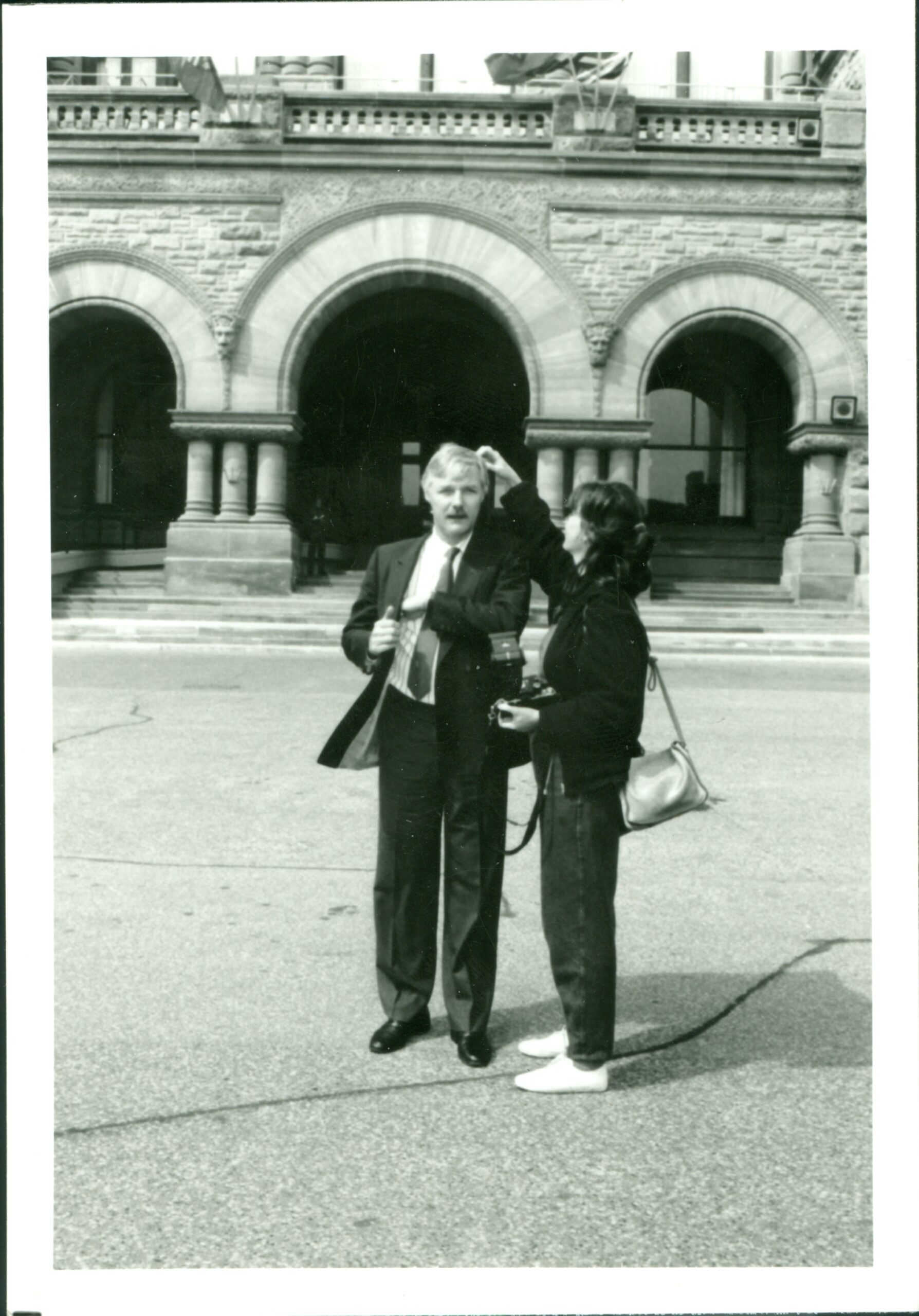 David in front of Ontario Legislature: photograph of David posing in front of the Ontario Legislature. Circa 1987.