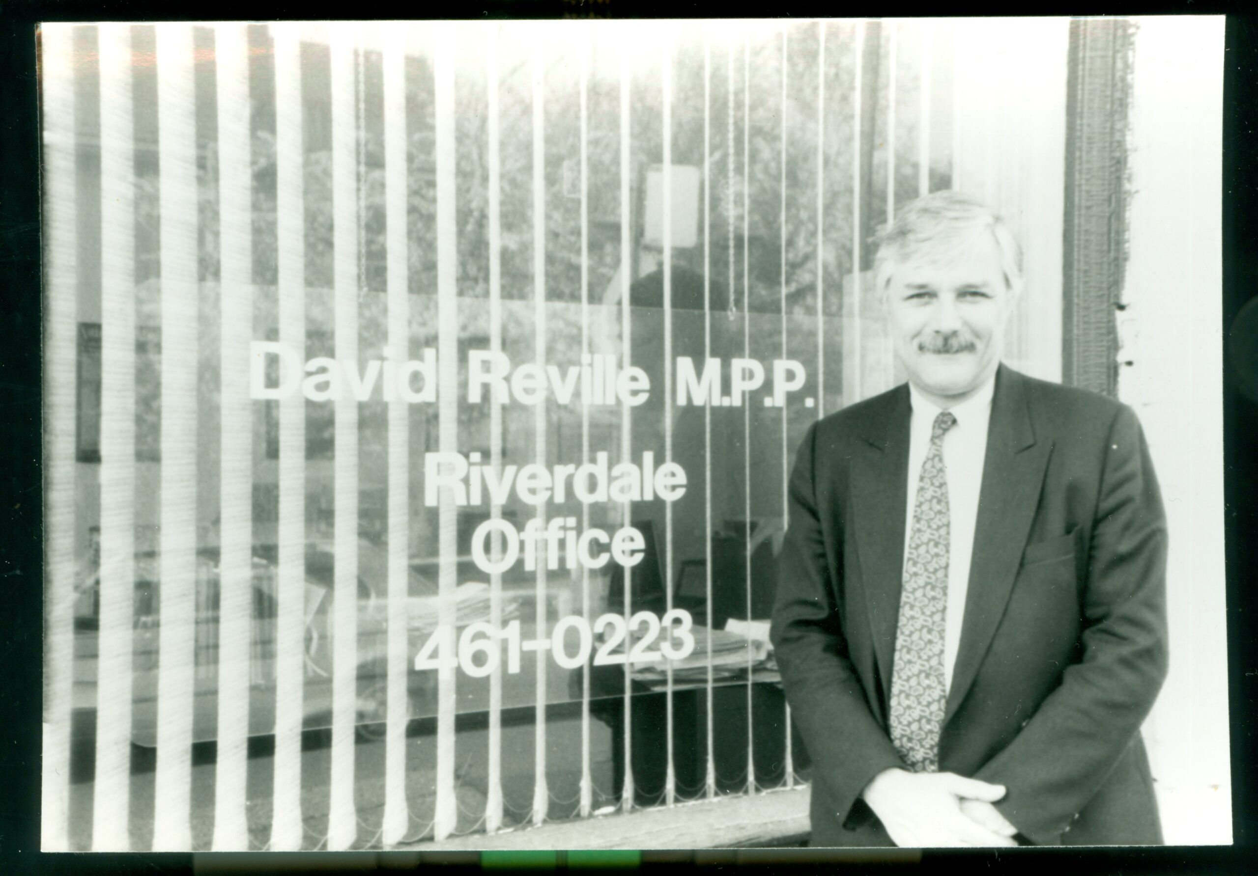 David’s Constituency Office: photograph of David posing in front of his constituency office in his electoral riding of Riverdale. Circa 1987.