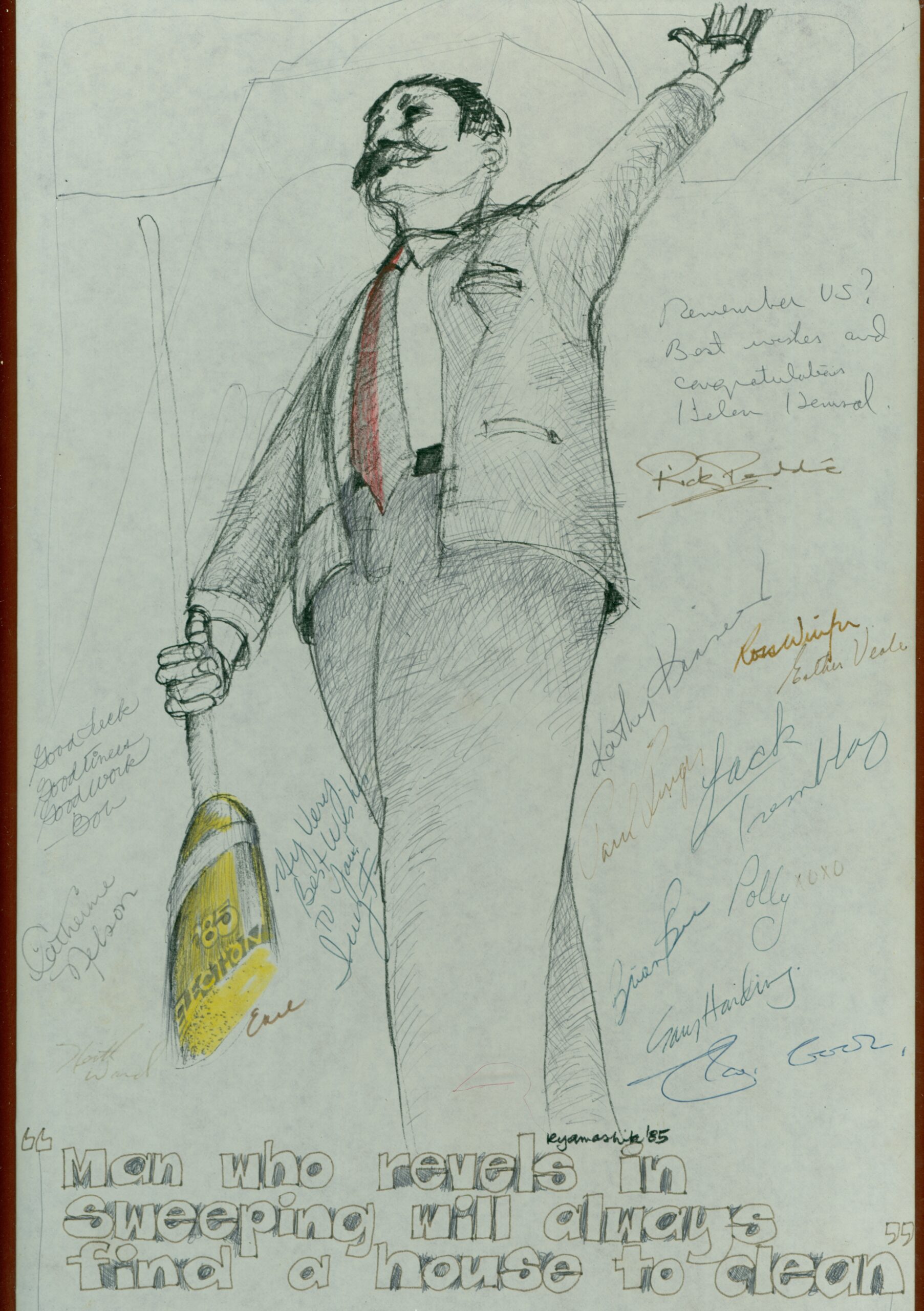 Leaving Civic Politics: political cartoon of a man with the caption “man who revels in sweeping will always find a house to clean” beneath it. Dated 1985.
