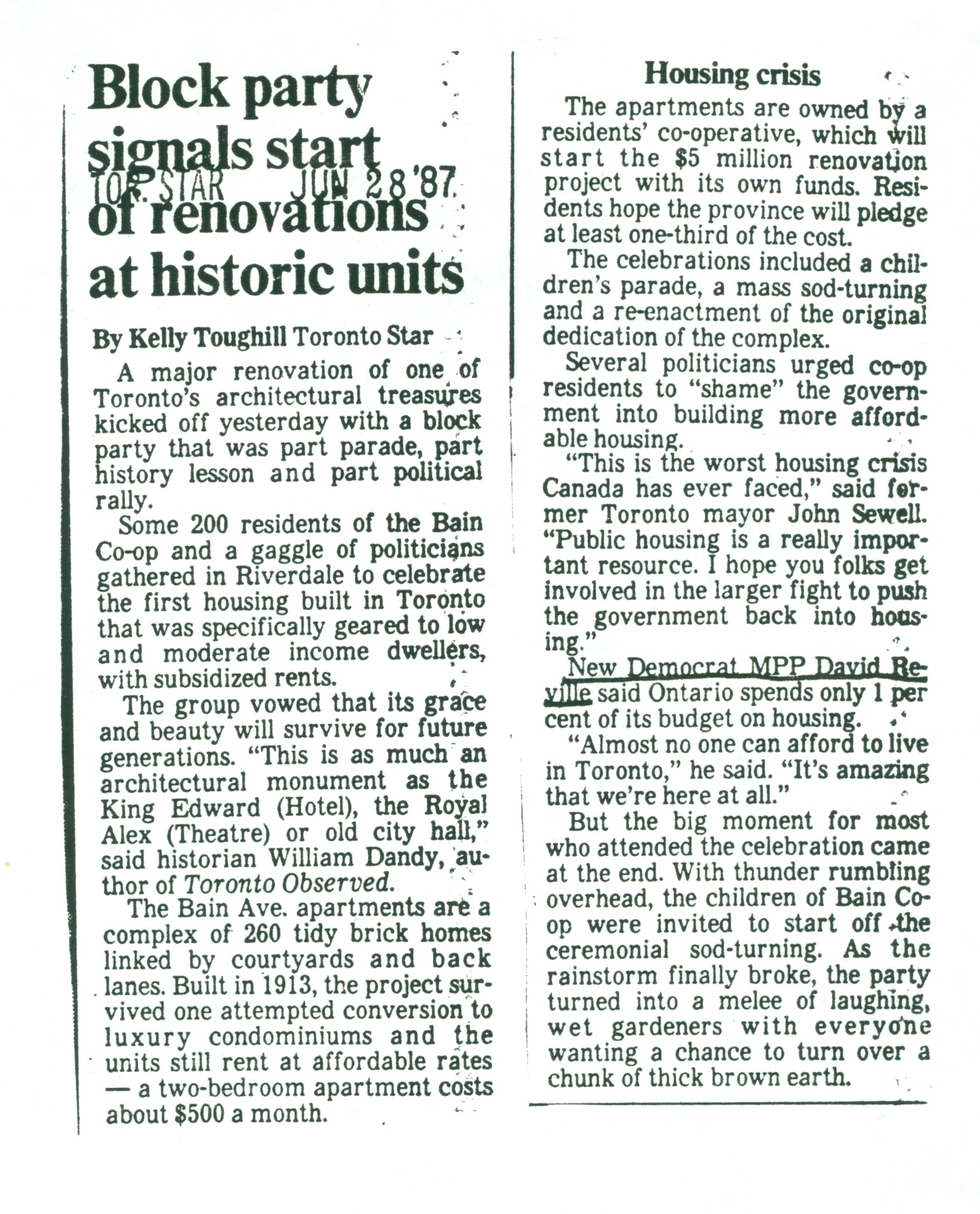Housing Crisis in Toronto: article from the Toronto Star titled “Block party signals start of renovations at historic units.” Article about a pioneering Toronto housing co-op. Dated June 28th, 1987.
