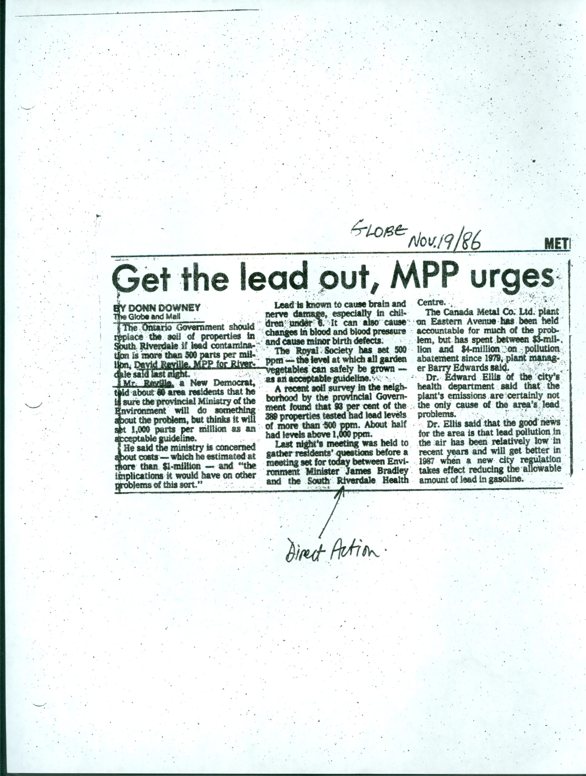 Lead Contamination in South Riverdale: article from The Globe and Mail titled “Get the lead out, MPP urges.” Dated November 19th, 1986.
