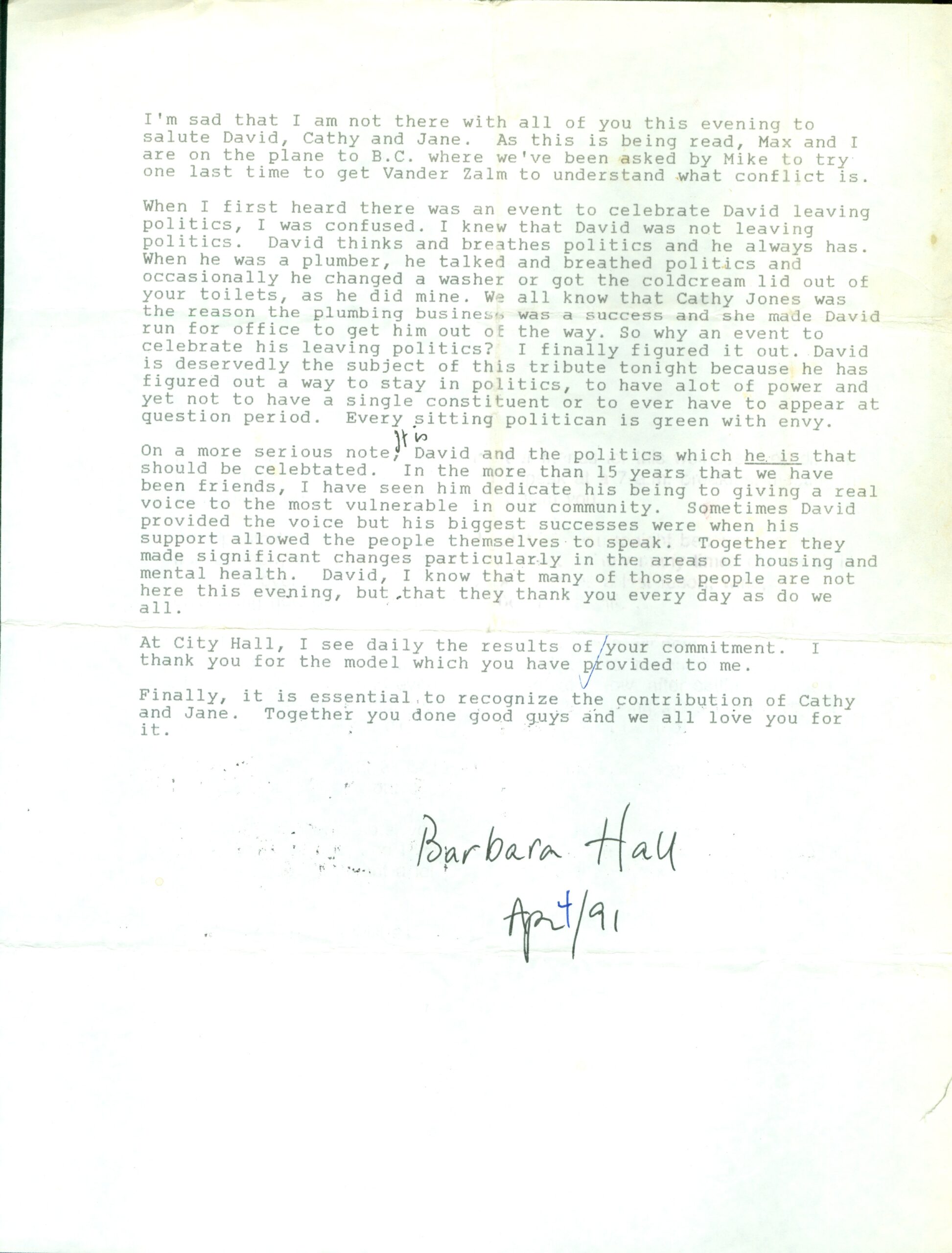 Letter from Barbara Hall: letter sent to David from B. Hall professing her admiration for David’s dedication to politics and for being a voice for the most vulnerable. Dated April 4th, 1991.