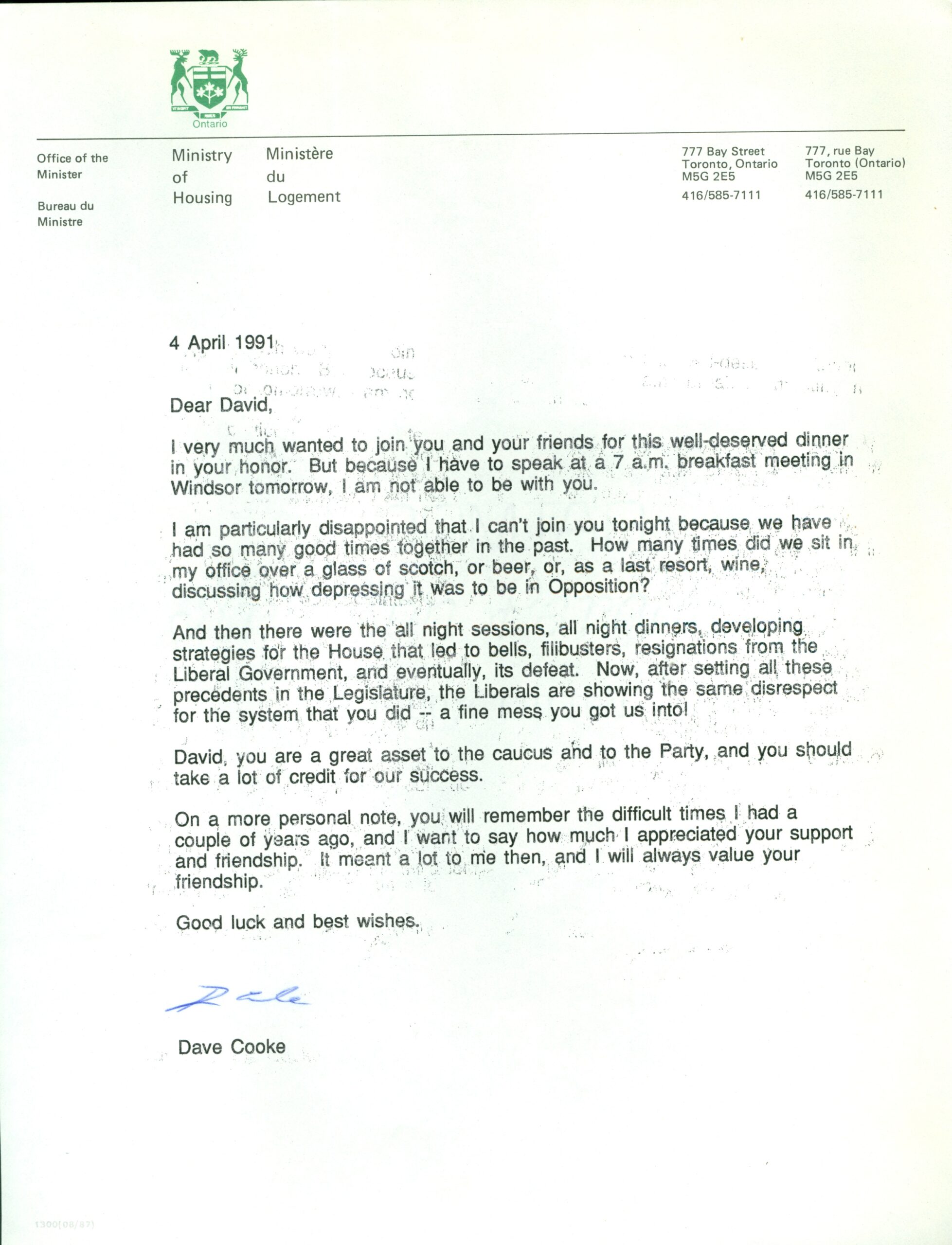 Letter from David Cooke: etter sent to David from D. Cooke reminiscing about their time spent together, and thanking him for his service and friendship. Dated April 4th, 1991.