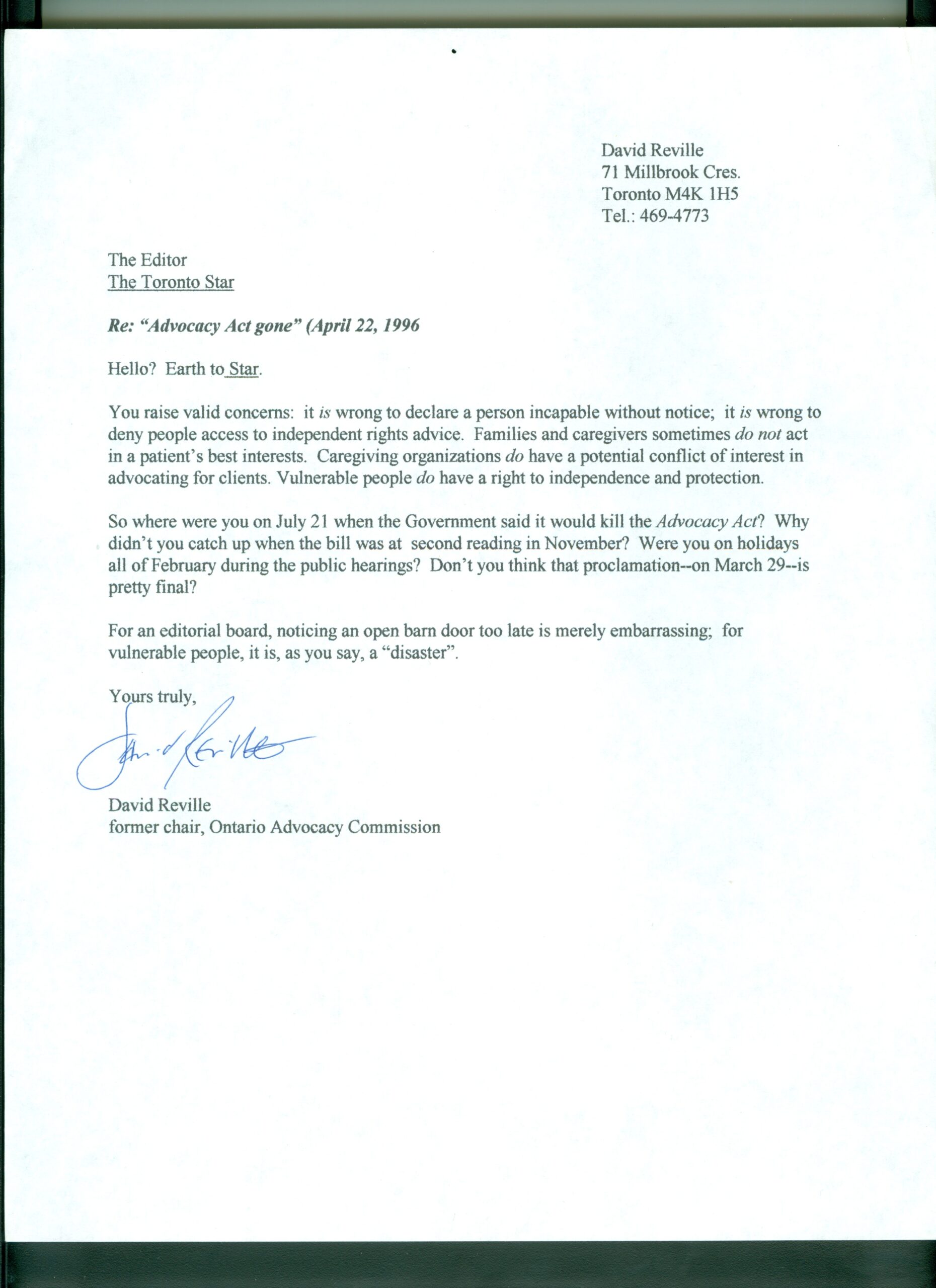 Letter to the Editor: letter addressed written by David addressed to the editor of an article titled “Advocacy Act gone” published in The Toronto Star on April 22nd, 1996, criticizing their article’s many flaws.