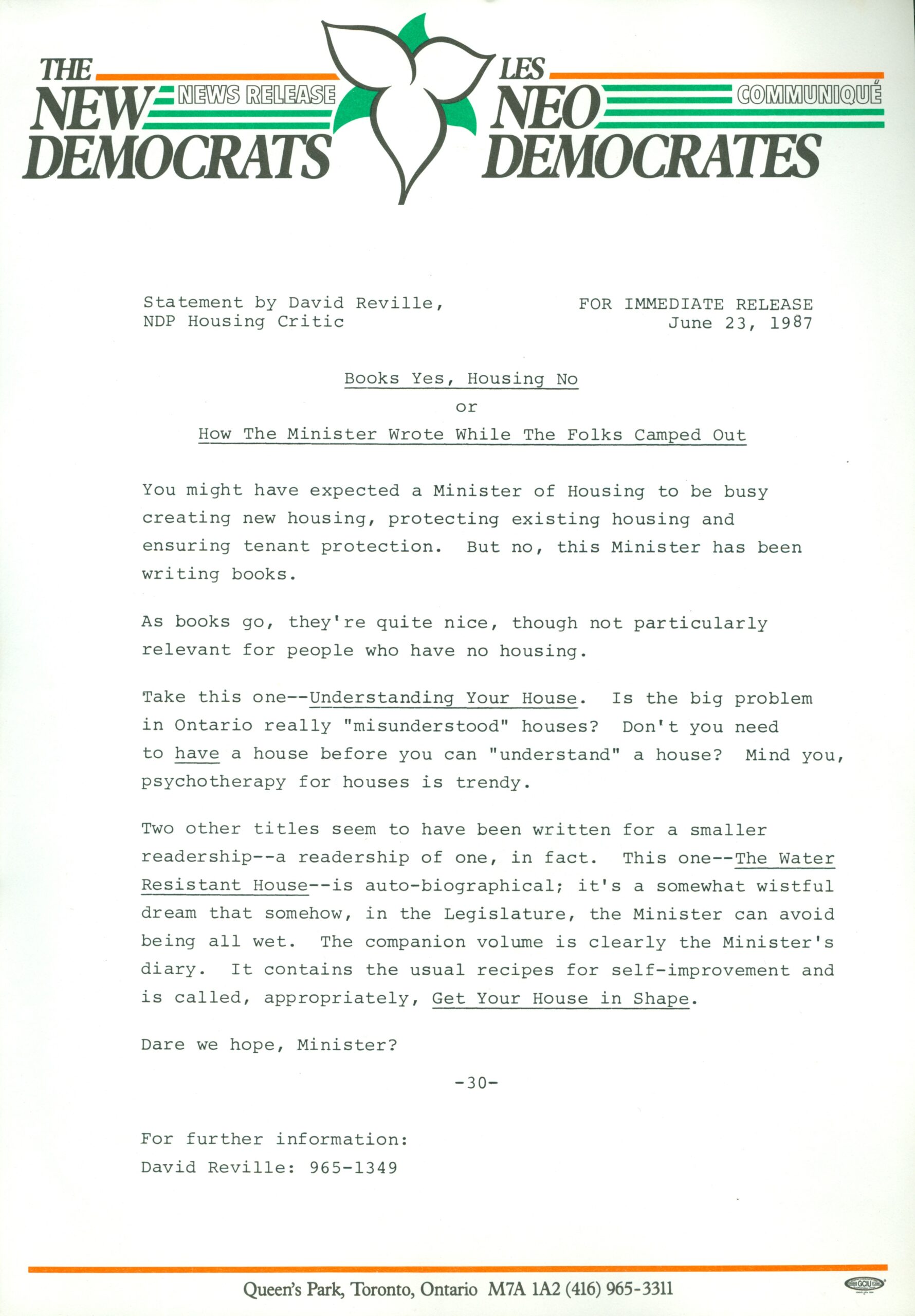 NDP News Release: news release given by David, the then NDP Housing Critic, a critique of the Minister of Housing’s actions. Dated June 23rd, 1987.