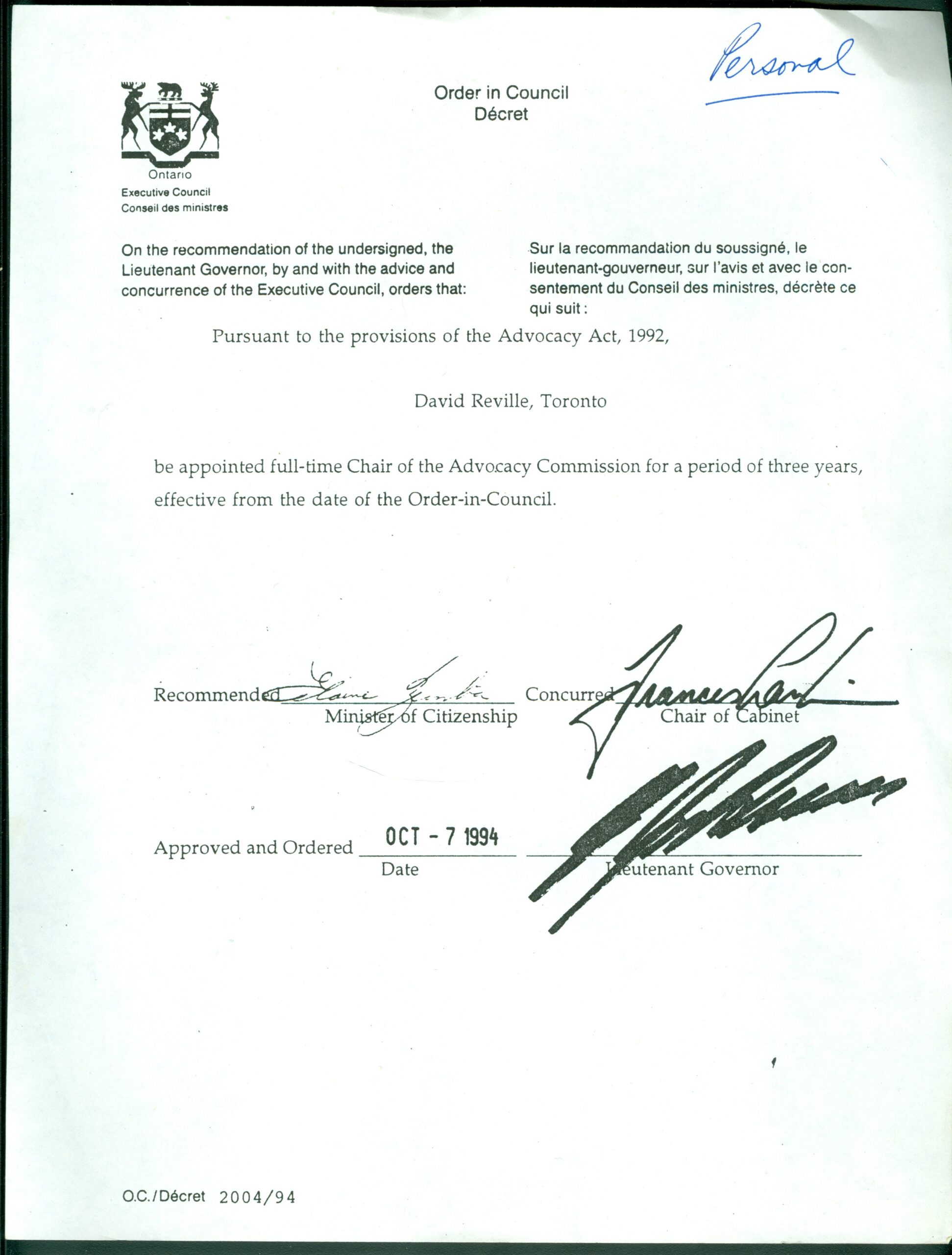 Official Chair Appointment: Order in Council appointing David to be the full-time Chair of the Advocacy Commission for the span of three years. Dated October 7th, 1994.