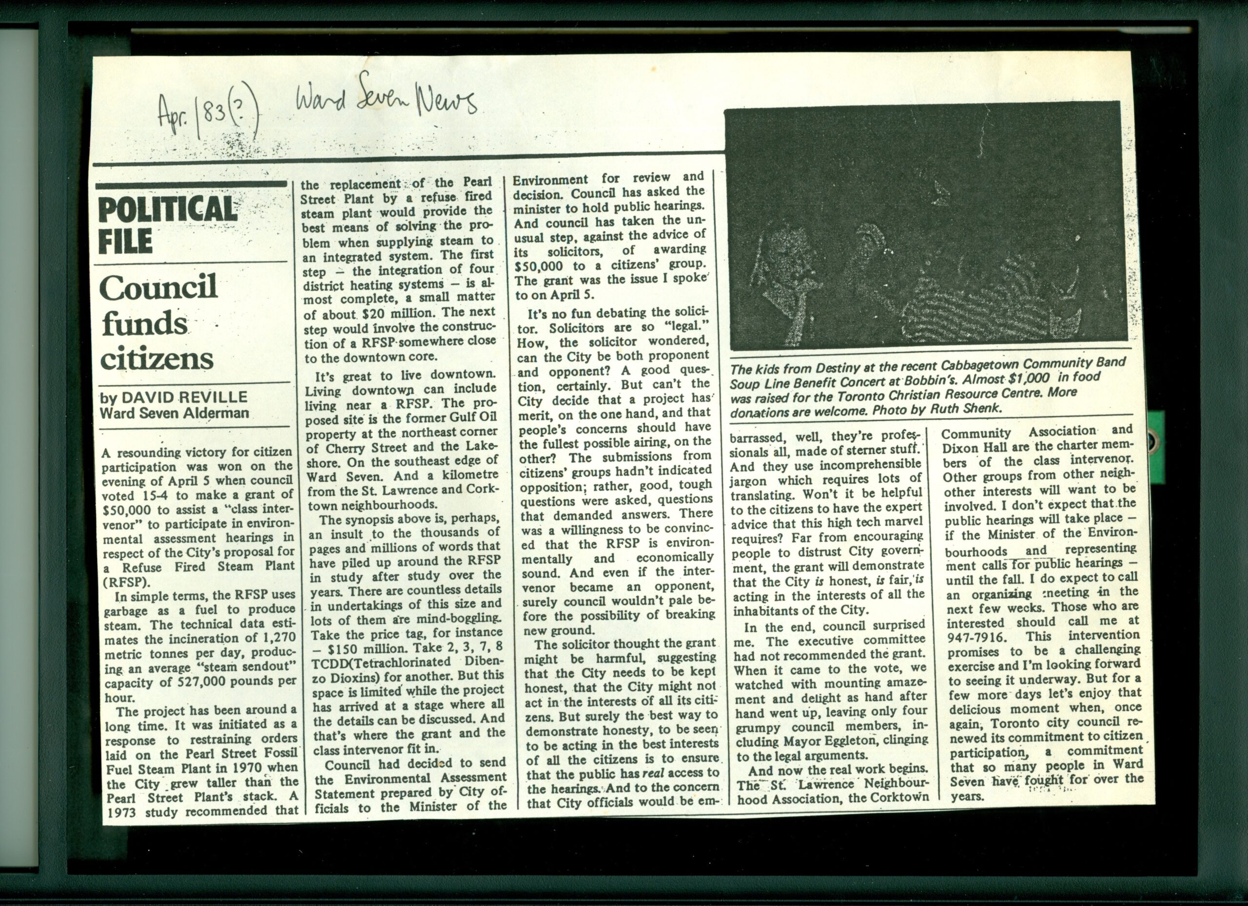 Environmental Citizen Engagement: article from the Ward Seven News titled “Council funds citizens” written by David when he was city councilor. It speaks to the city-approved grant of $50,000 to fund citizens’ group. Dated April 1983.