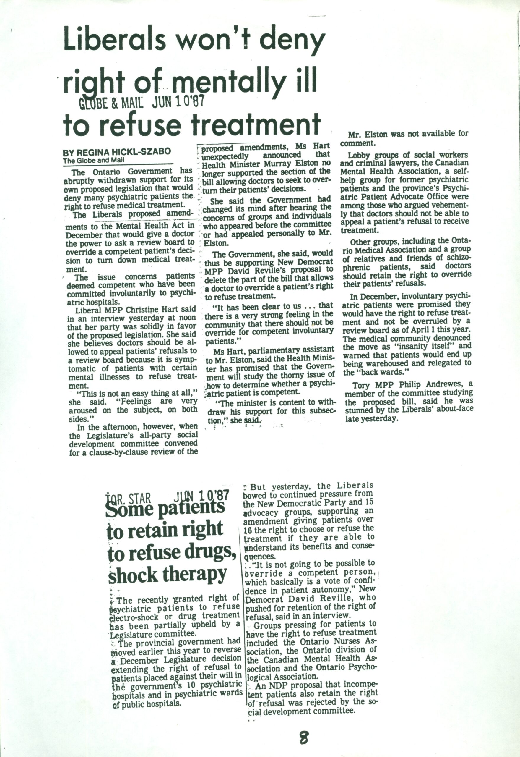 Mental Health Legislation: two newspaper clippings discussing the provincial legislature’s decision to allow mental health patients to refuse medical treatment, demonstrating that it is possible for opposition members (in this case David) to change the law; the first article is from The Globe and Mail and the second is from the Toronto Star. Both dated June 10th, 1987.