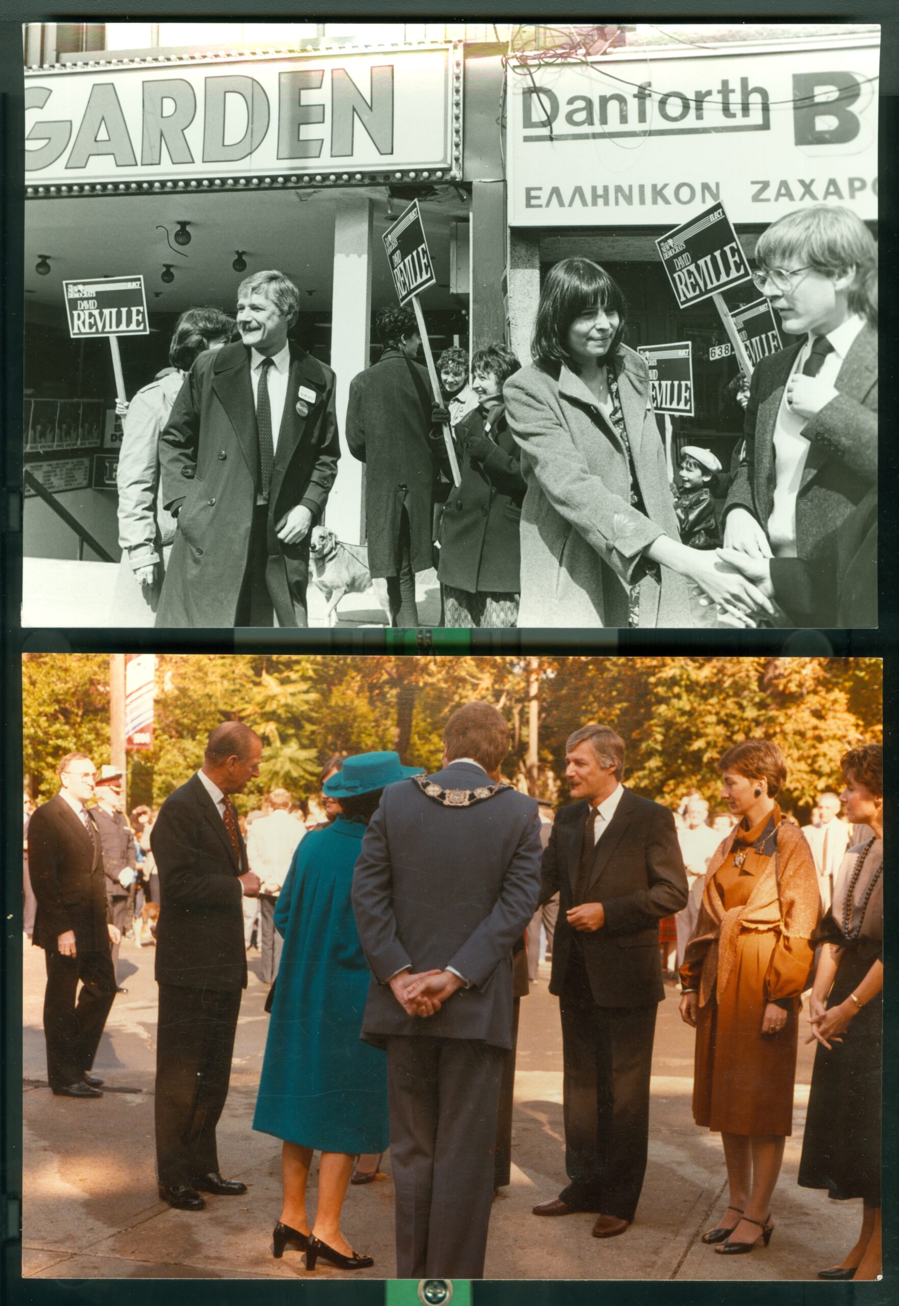 Two Photographs of David: first photograph is of David with Bob and Arlene Rae on the Danforth. Dated 1985. Second photograph is of when David met Queen Elizabeth II in Riverdale Park. Dated 1984.