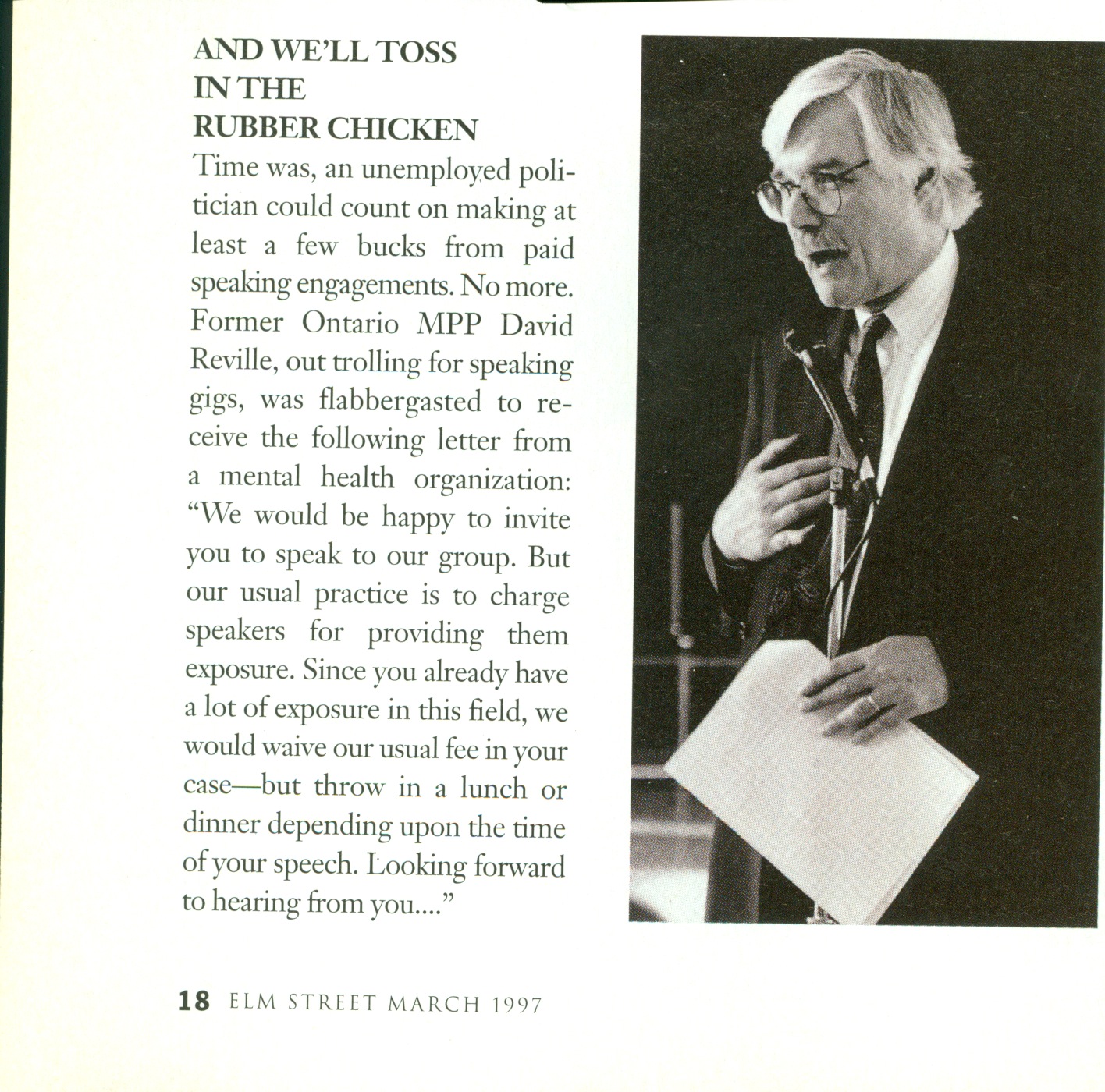 Patient Self-Help Group: article about David’s speech in Brockville regarding a new self-help group from the Brockville Recorder & Times titled “Fight by mentally ill for dignity must be expanded, says Reville.” Dated January 17th, 1991.