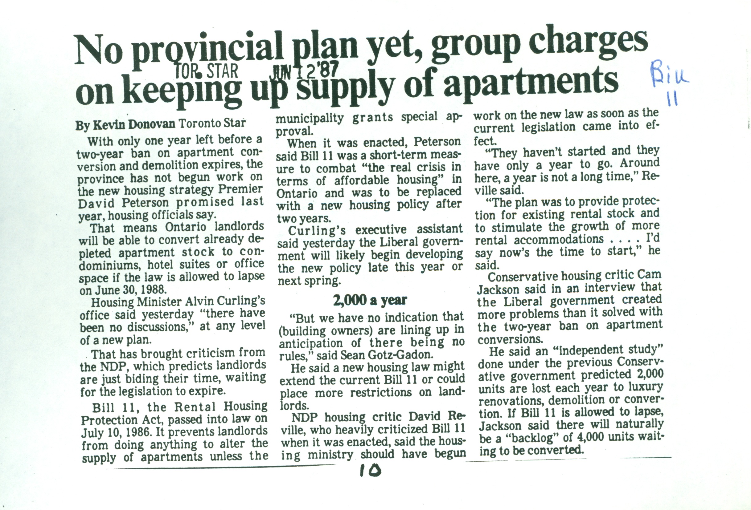 New Housing Law: article from the Toronto Star titled “No provincial plan yet, group charges on keeping up supply of apartments.” Relates to Bill 11, the Rental Housing Protection Act, and David’s critique of the Liberal government inaction on housing. Dated June 12th, 1987.