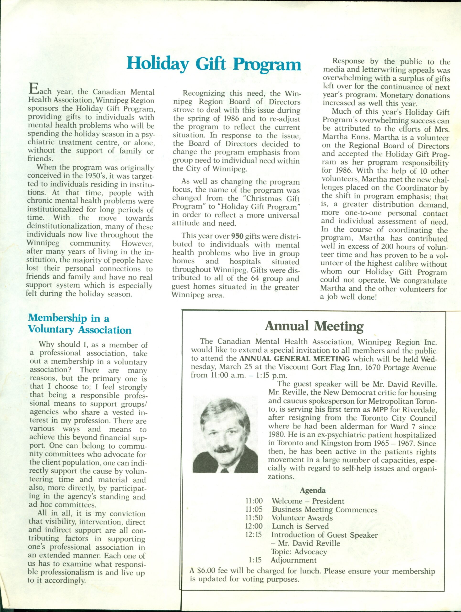 Winnipeg Annual General Meeting: sub-section of paper discussing The Canadian Mental Health Association’s Annual General Meeting, where David served as the guest speaker. Dated March 1987.